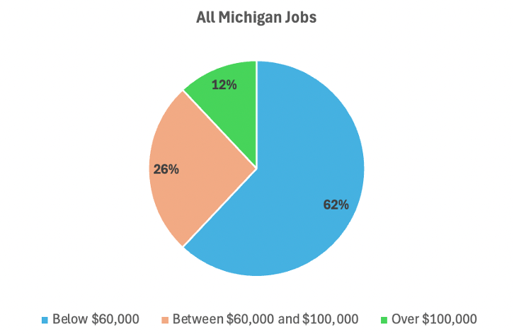 Takeaway #1: 6 out of every 10 Michigan jobs pay less than $60,000. Most Michigan jobs do not pay high wages. This should have significant implications for how we think about economic development and social safety-net policies.