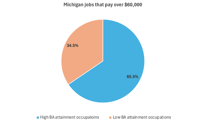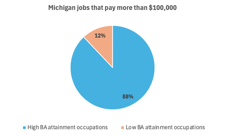 Takeaway #3: 9 out of every 10 jobs that pay over $100,000 are in high BA-attainment occupations. There are just 540,000 jobs in Michigan that pay more than $100,000. 480,000 of those jobs are in high BA-attainment occupations.