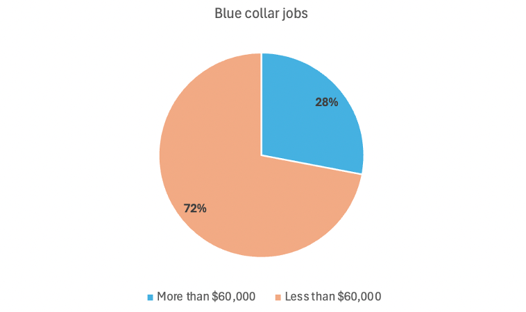 Takeaway #4: Nearly three quarters of blue-collar jobs pay less than $60,000. We define blue collar jobs as those in production; construction; installation, maintenance, and repair; and transportation and material moving. Media narratives suggest most of these jobs – which don’t require a BA – are high-paying. However, the data does not match that narrative. 72 percent of jobs in these occupational categories pay less than $60,000.