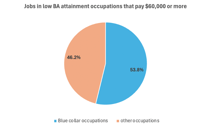 Takeaway #5: Among the good-paying jobs in low BA-attainment occupations, roughly half are in blue-collar occupations. Though most blue-collar jobs are low-paying, there are roughly 325,000 blue-collar jobs that pay more than $60,000, making up roughly half of the good-paying jobs in low BA-attainment occupations. However, this means that that there are roughly 275,000 good-paying jobs in low BA-attainment occupations that are not in blue-collar occupations. These are jobs we rarely hear about. There are more than 100,000 good-paying jobs in office and administrative support and 89,000 good-paying sales jobs, most of which do not require a BA.