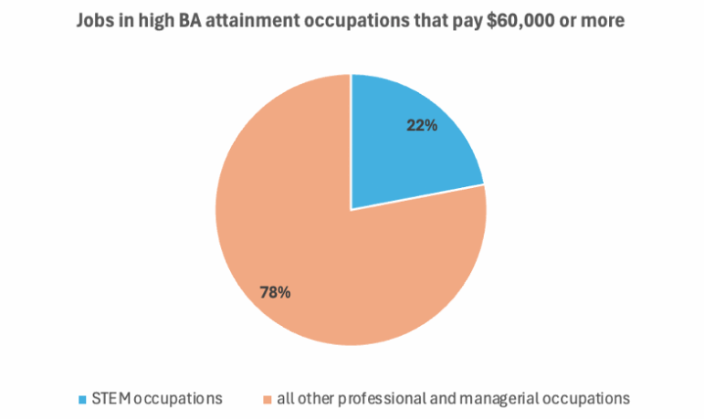 Takeaway #6: Among the good-paying jobs in high BA-attainment occupations, most are not in STEM occupations. Another popular narrative is that all the high-paying jobs are in STEM fields. This also turns out not to be correct. Of the 1.1 million jobs paying more than $60,000 in high BA-attainment occupations, just 236,000 (22%) are in STEM fields (architecture and engineering; computers and math; life, physical, and social sciences).