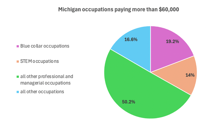 Takeaway #7: Half of all jobs in Michigan that pay more than $60,000 are in non-STEM, high BA-attainment occupations. Blue collar jobs, STEM jobs, and a collection of other jobs all make up a piece of the Michigan jobs paying more than $60,000. But half of the pie is made up of non-STEM professional and managerial jobs that require a BA.